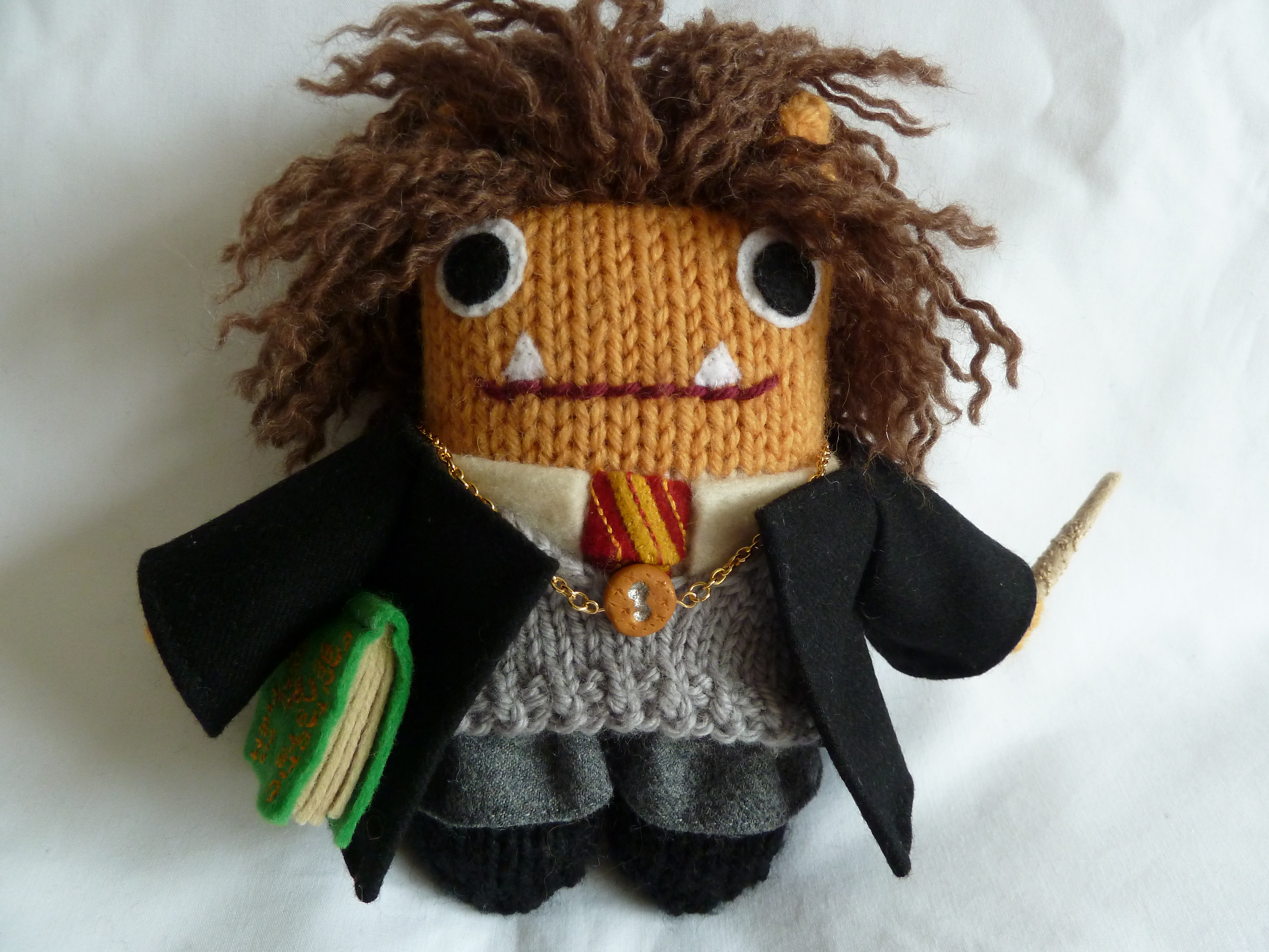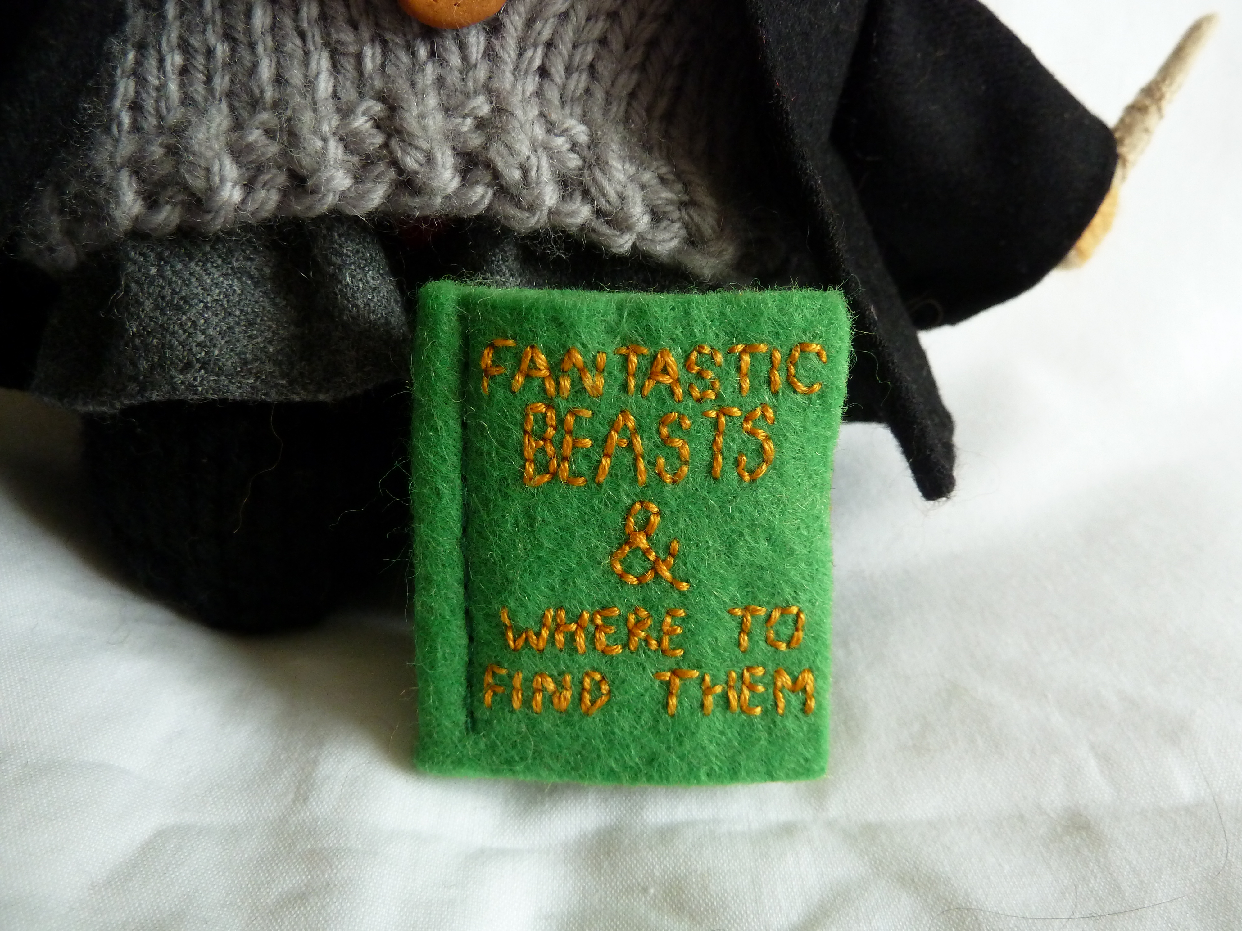 Hermione was selected to be Harry’s companion, which was absolutely fine with me! I was looking forward to trying out a girl’s version of the Hogwarts uniform – so although Hermione Beastie has the same white shirt, Gryffindor tie and black robes I used for Harry, I’ve given her black tights, a grey skirt (I had some suitably school-uniform-y material in my vast fabric reserves) and a grey knitted sweatervest.