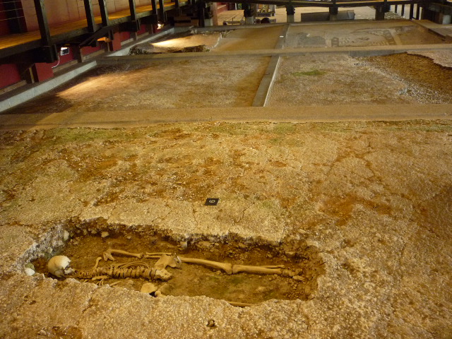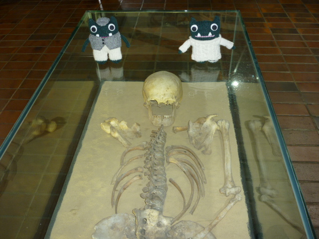 That Shouldn't Be There! Saxon Burial at Fishbourne - H Crawford/CrawCrafts BeastiesAccording to our trusty friend Wikipedia, Fishbourne burnt down in around 270AD, and was subsequently abandoned. Apparently they were doing extensive renovations at the time, so perhaps the builders decided to focus their energies on building a new villa, instead of fixing up an old one. Paddy is reasonably sure that this could have been the first recorded instance of an insurance scam, but Plunkett, as usual, needs more convincing. Anyway, many years later, the site was used as a Saxon burial ground – some of the graves cut right down through the mosaic floors! A few of them, like the one above, have been left in situ… But some of the Saxon remains have been exhumed for closer inspection by curious visiting Beasties.