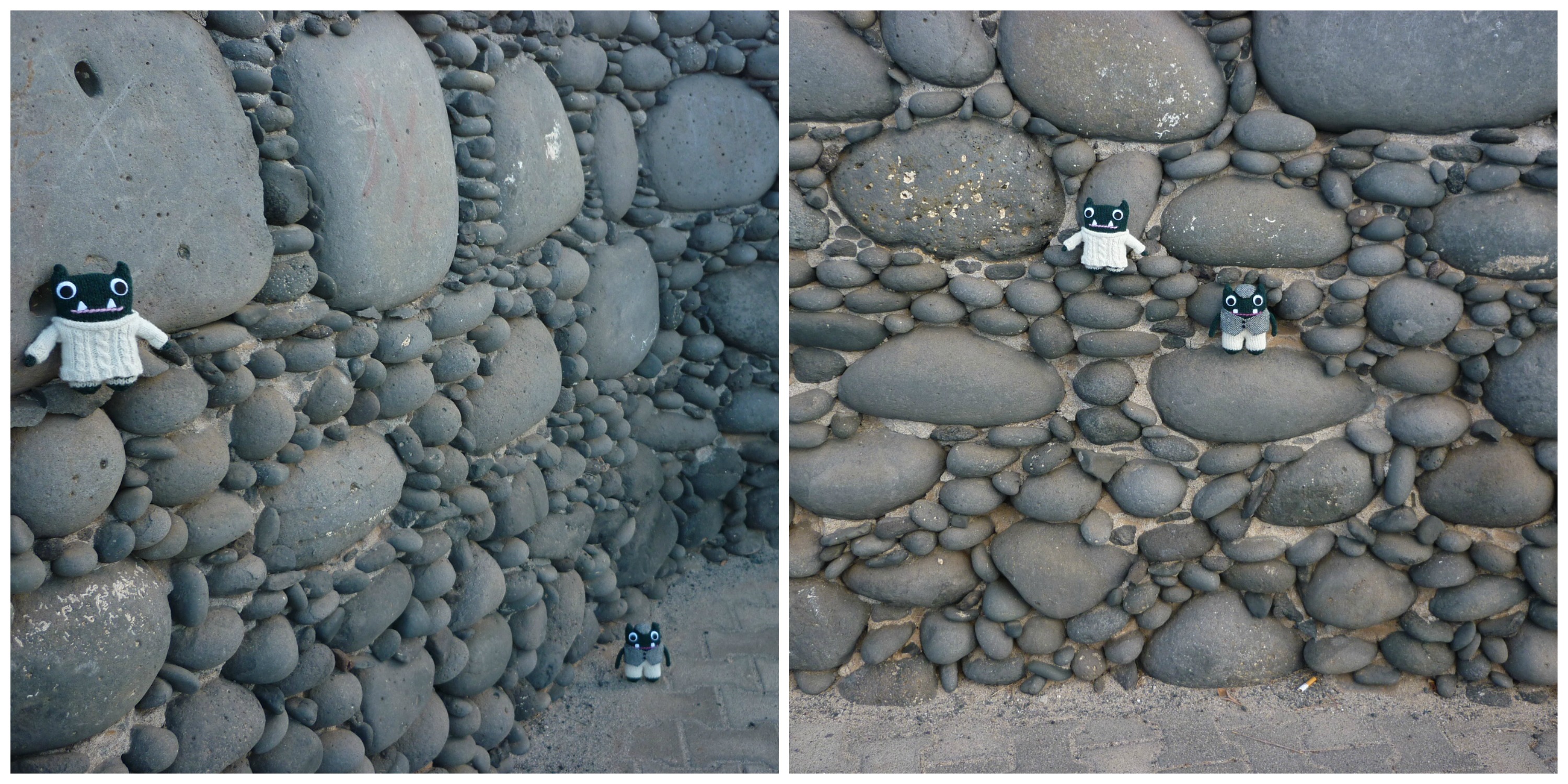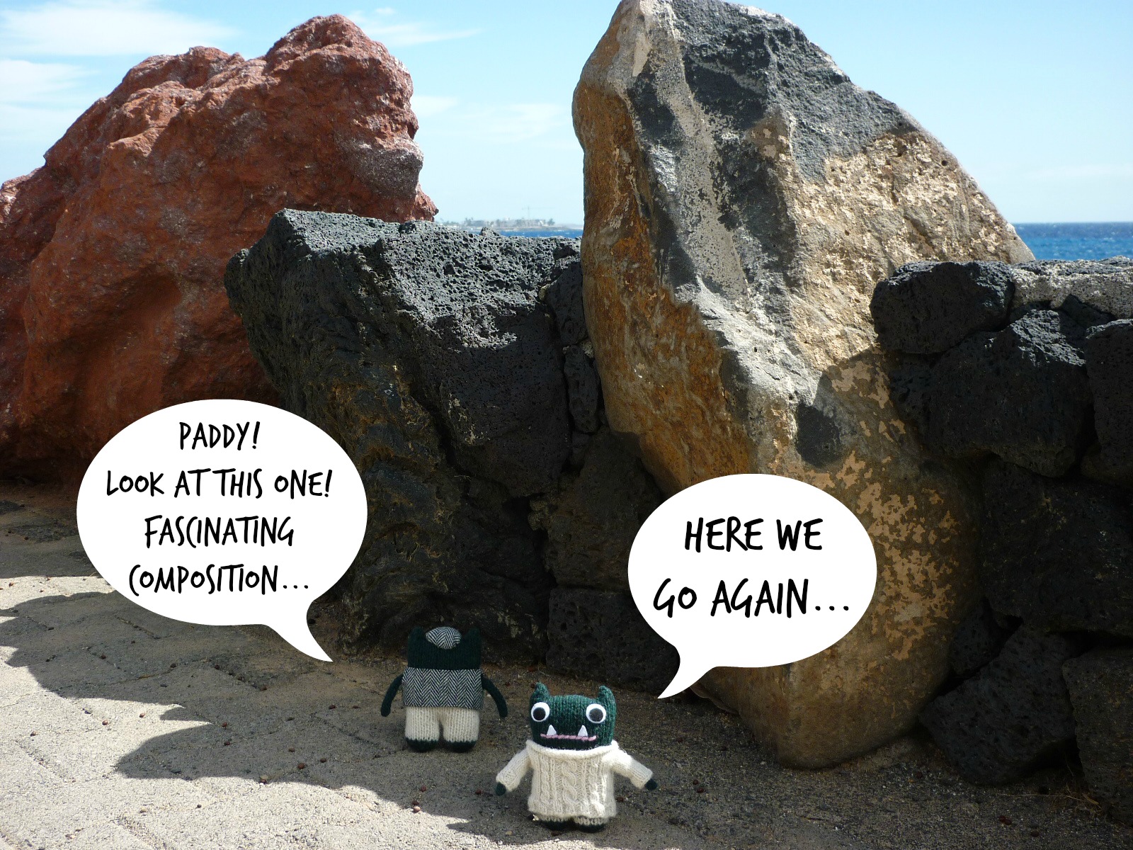 Rock On, Paddy and Plunkett! H Crawford/CrawCrafts BeastiesToday, their wandering paws have brought them to a part of the island that’s all rocks. Paddy’s not impressed – he had his fuzzy little heart set on building sandcastles. But Plunkett is in his element!