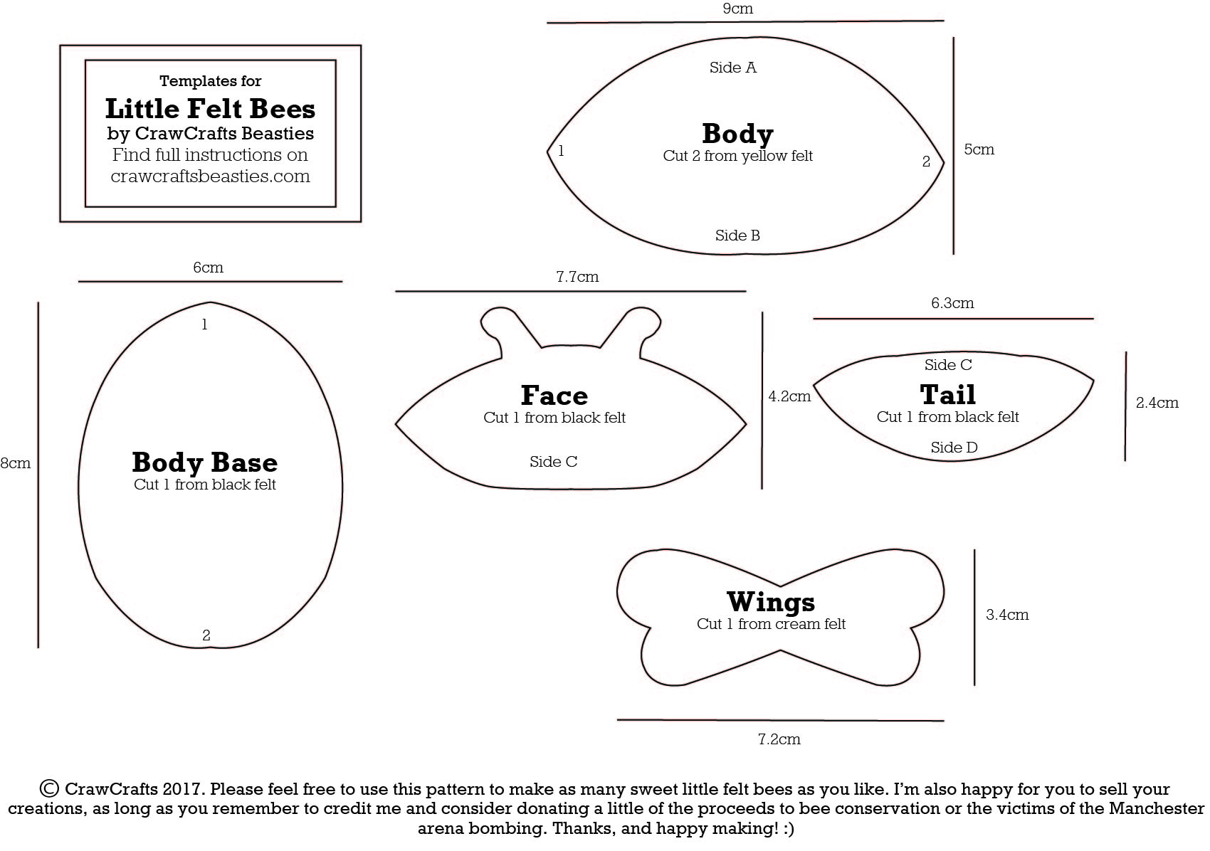 10. Next, attach the tail piece to the bee’s bottom (point 2) in the same way as you attached the face piece. Side C covers the line of black stitches at the base, while the zigzag edge goes over the bee’s back. Pin in place, then stitch as before…