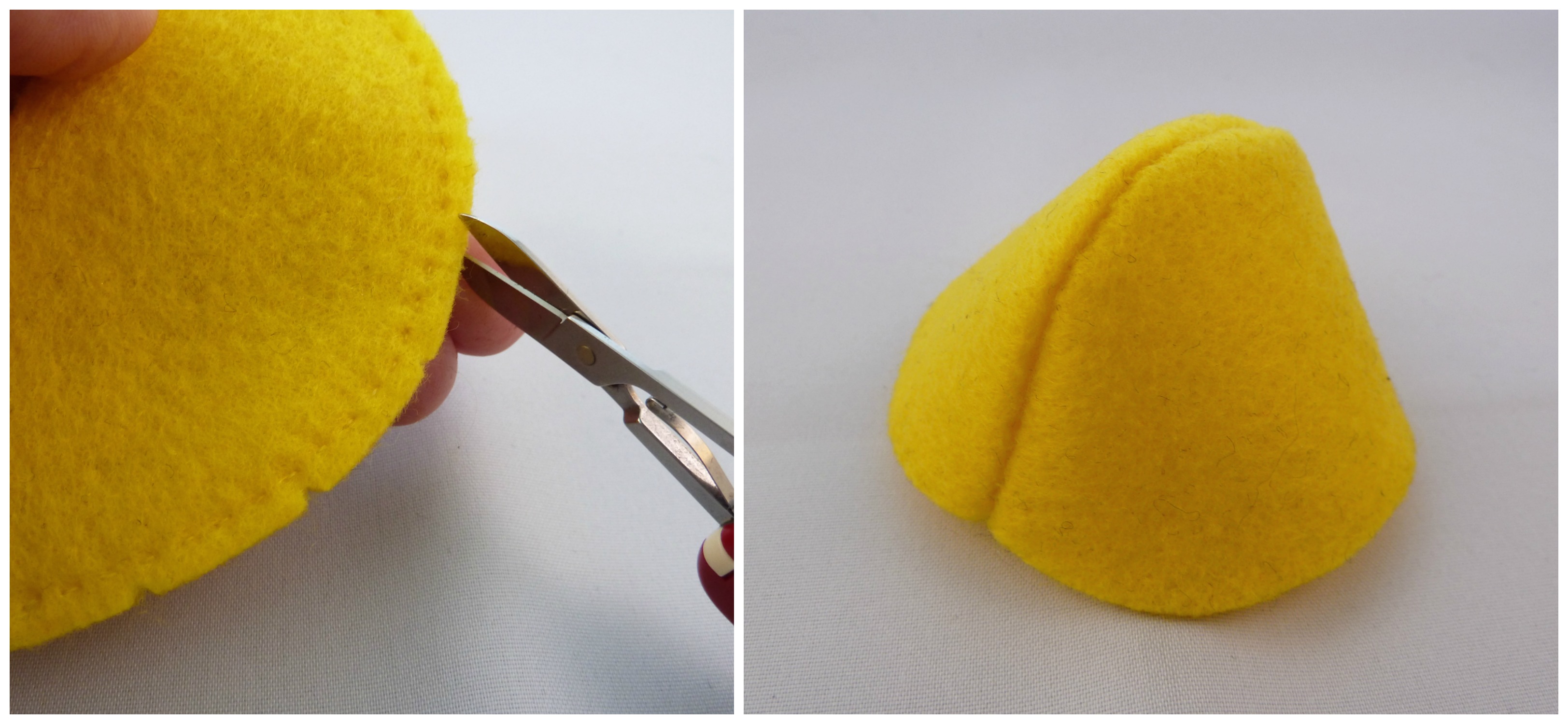 4. For a smoother curve, cut a few notches at intervals along the edge of the felt, near to (but of course not actually touching) the seam. Then turn the body “shell” right side out.