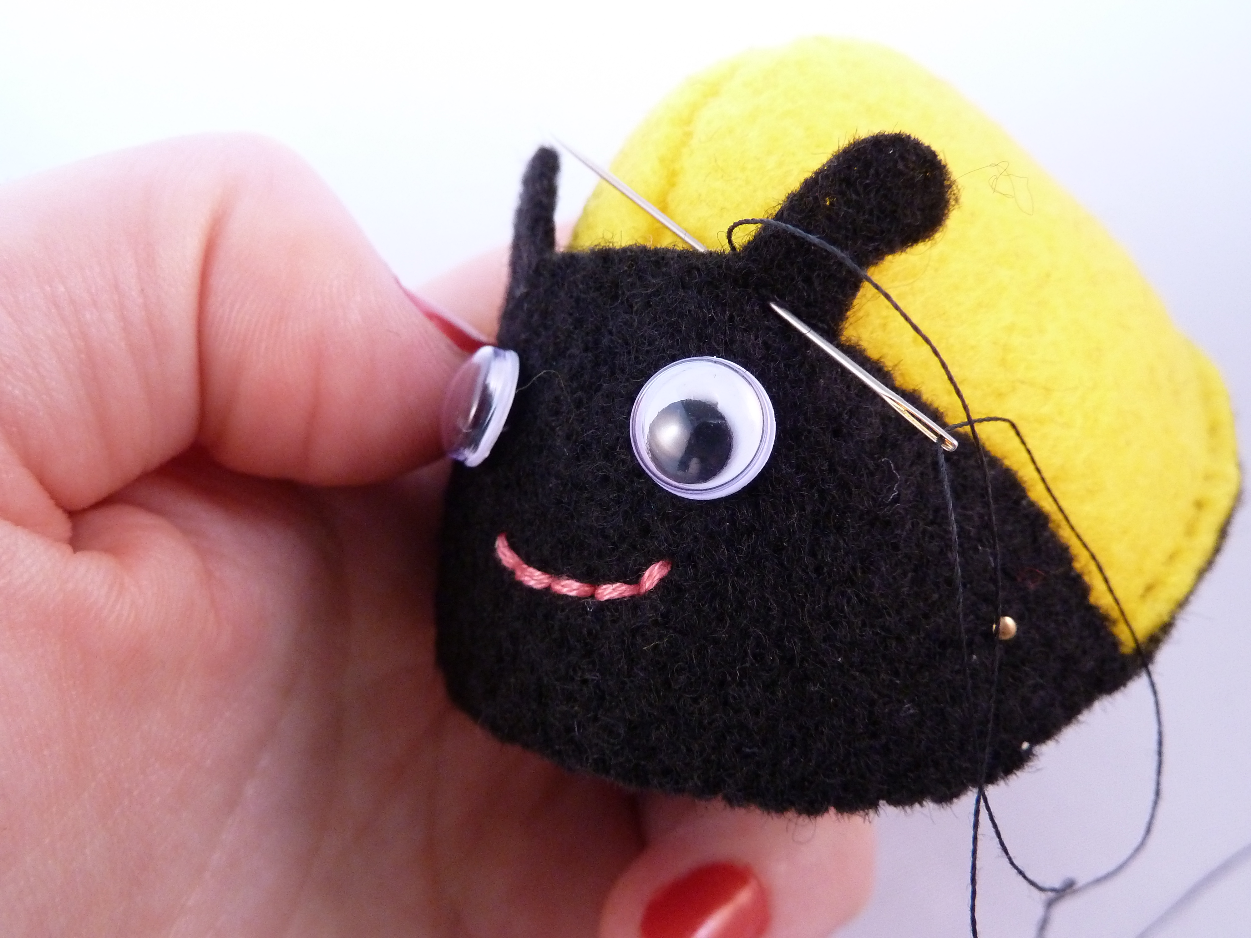 When you get to the antennae, sew a couple of backstitches across the base, so that they can stand up from the bee’s head.