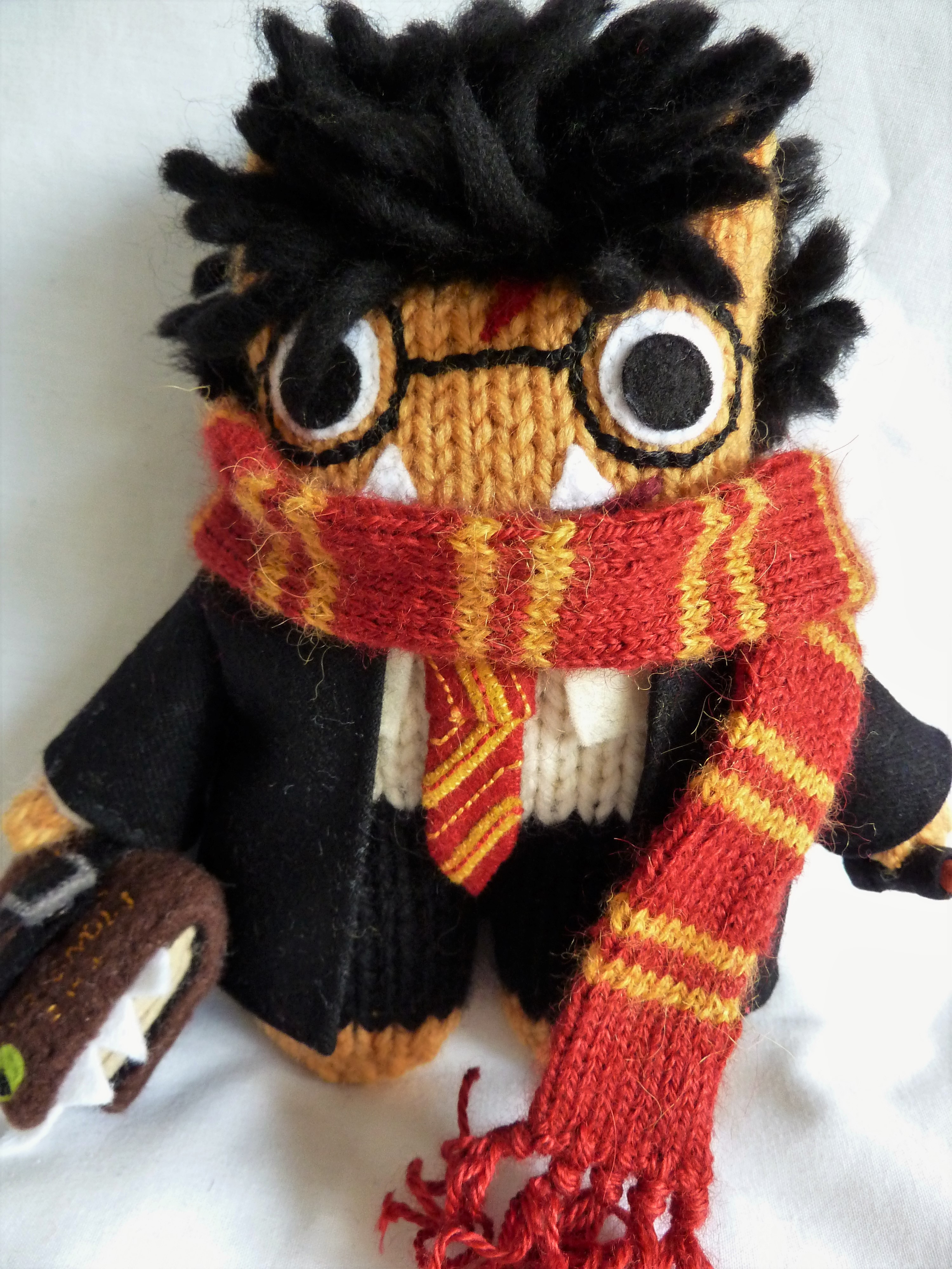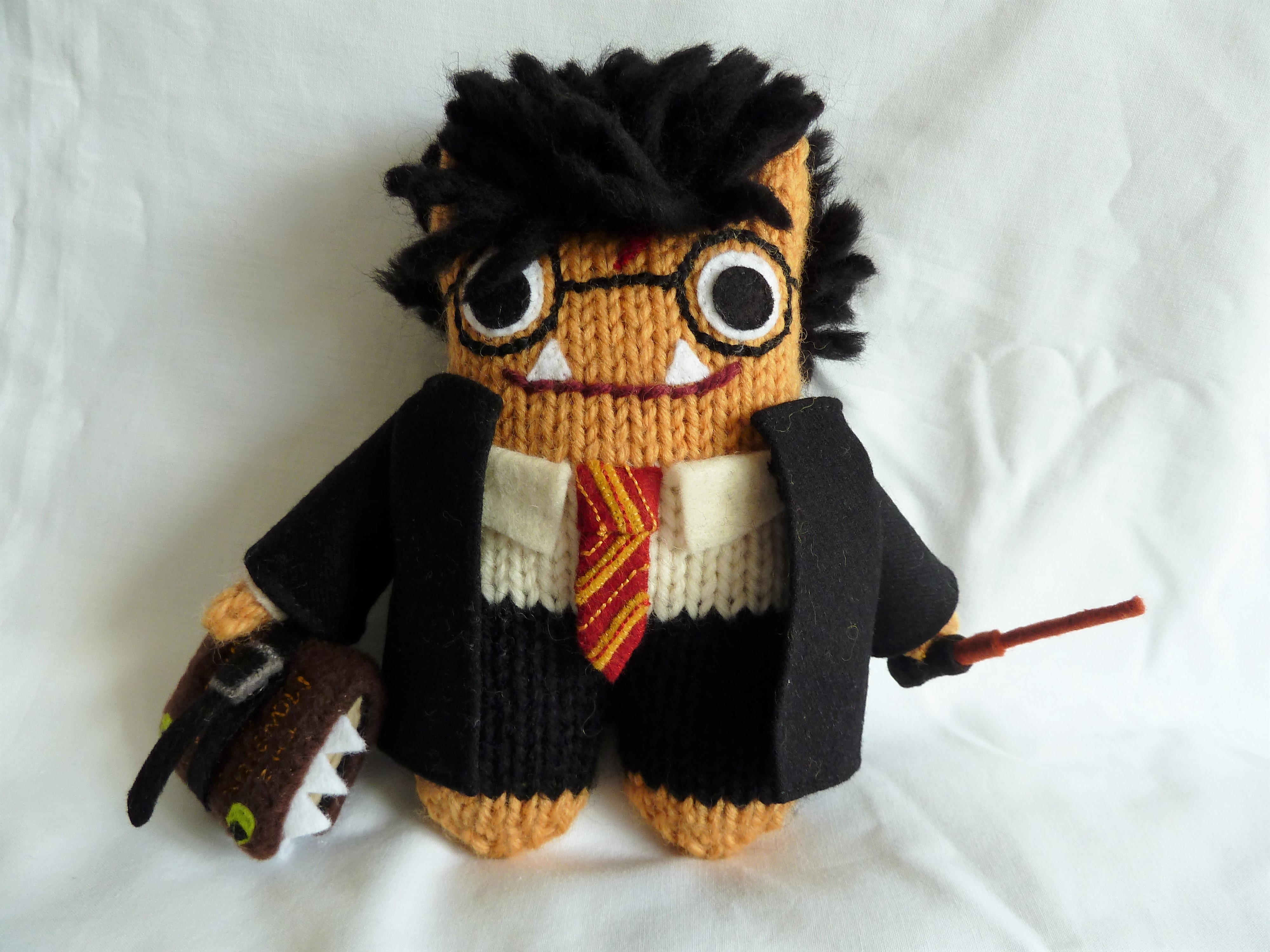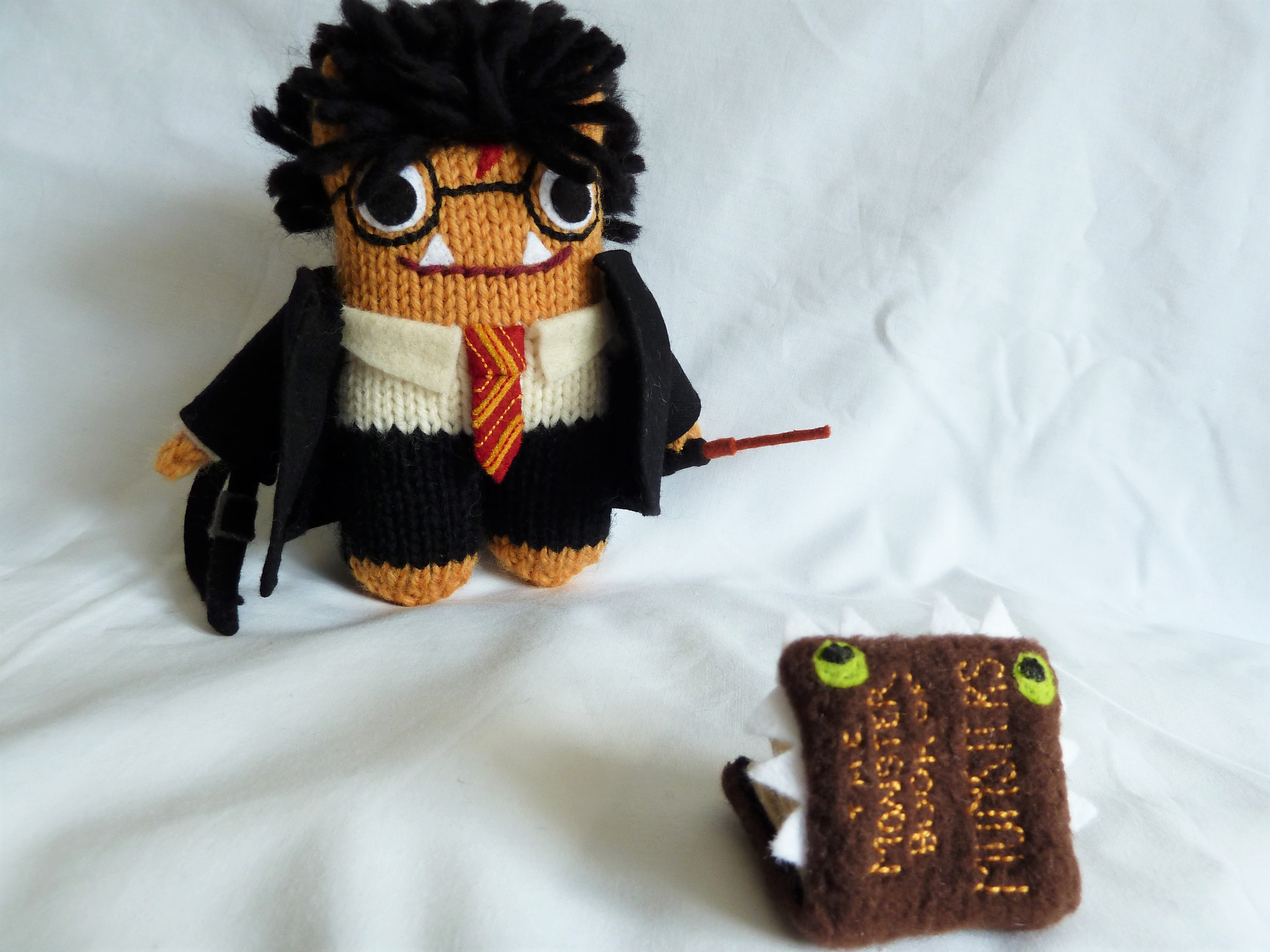 - Accessories: Handmade felt wand and handstitched and embroidered “Monster Book of Monsters”, made from felt and fleece fabric