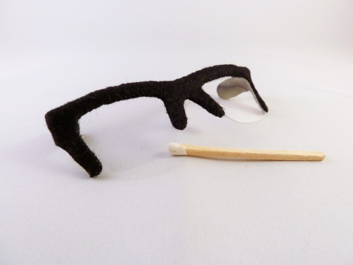 - Accessories: Felt and wire glasses with plastic lenses, handknitted hat, felt welly boots, handknitted shoulder bag with felt lining, felt chili plant, felt trowel, felt Flying V guitar, embroidered felt notebook and pen, felt soldering iron, felt backpack. All felt pieces hand stitched or needle-felted.