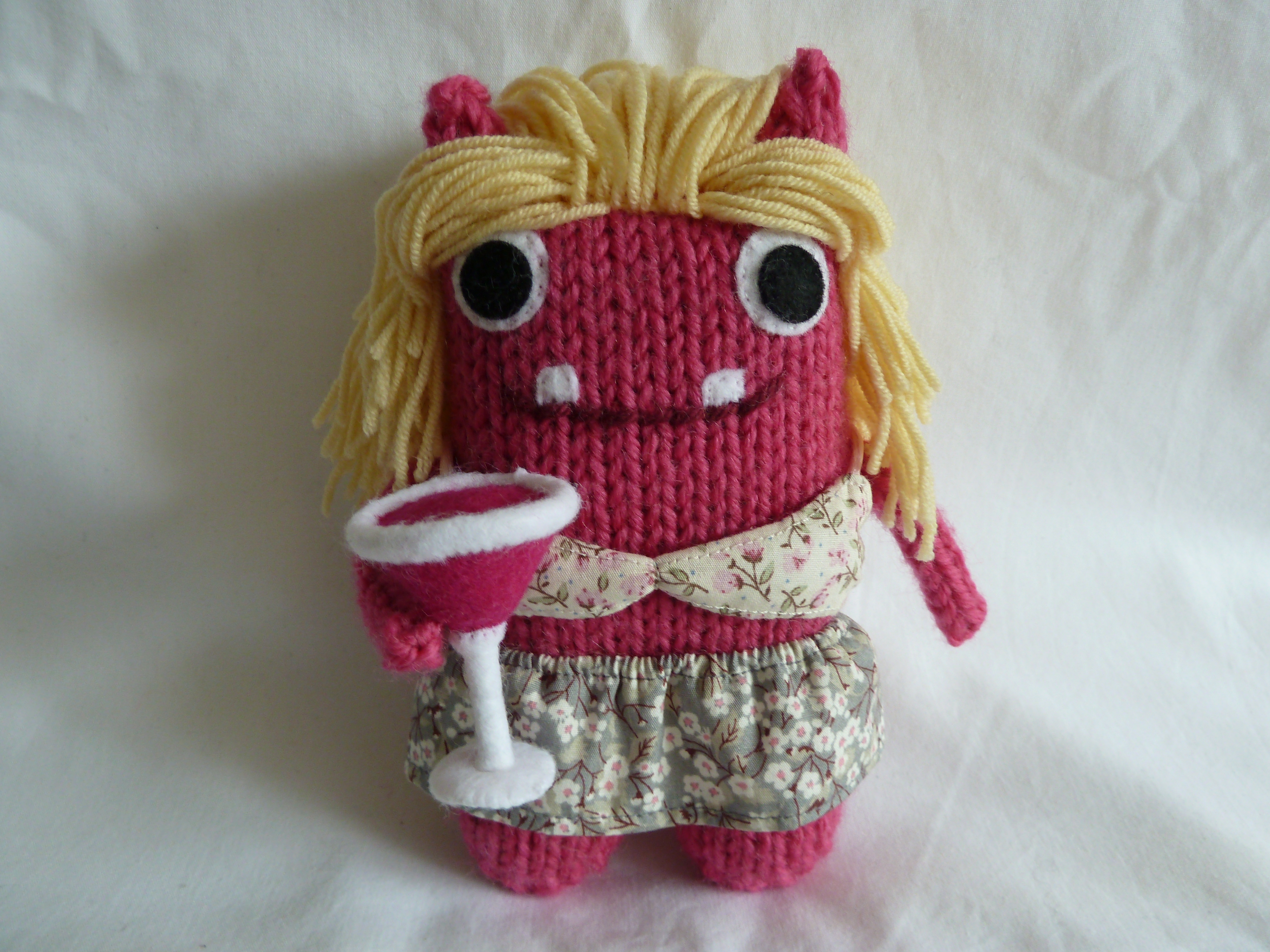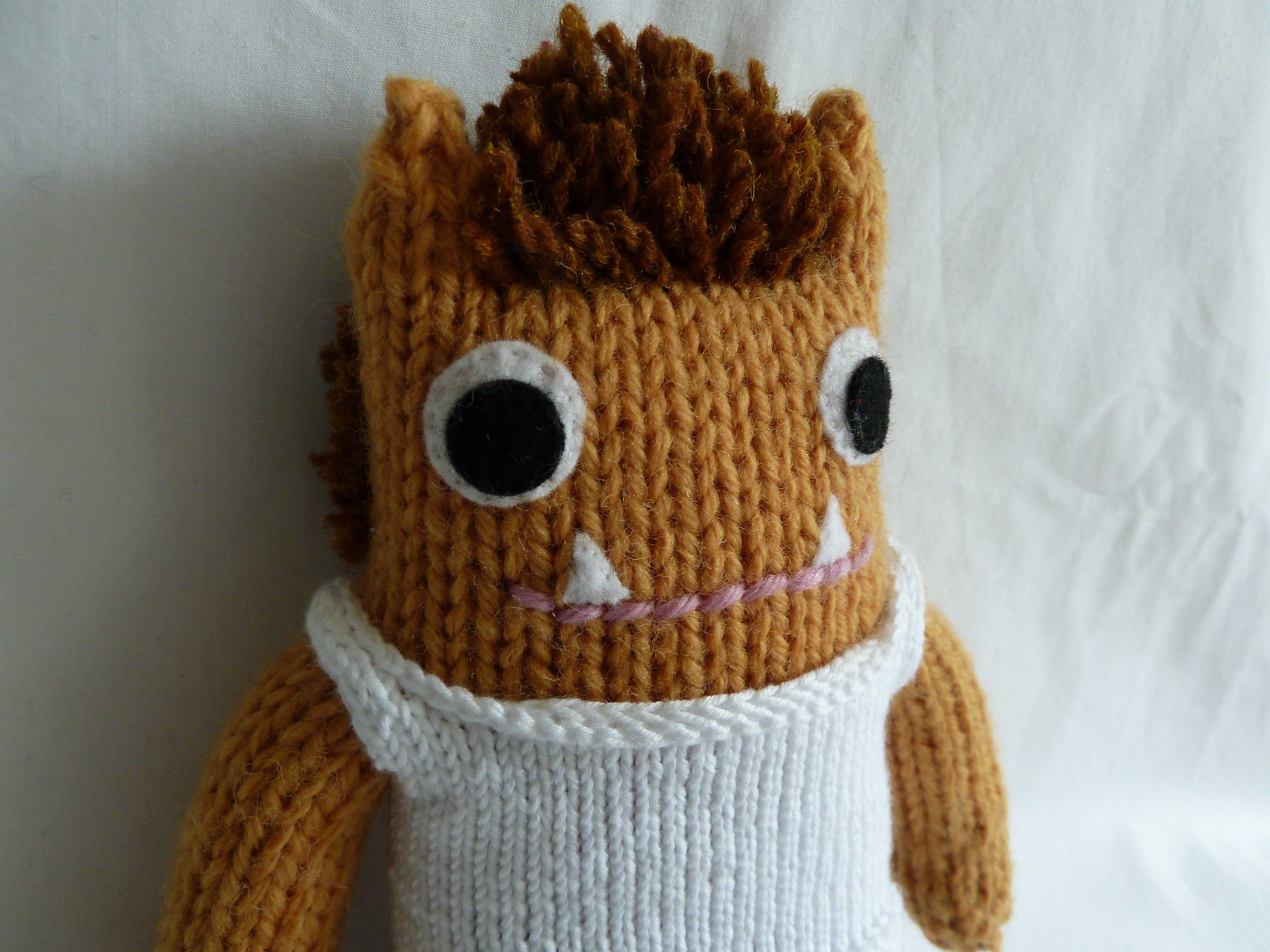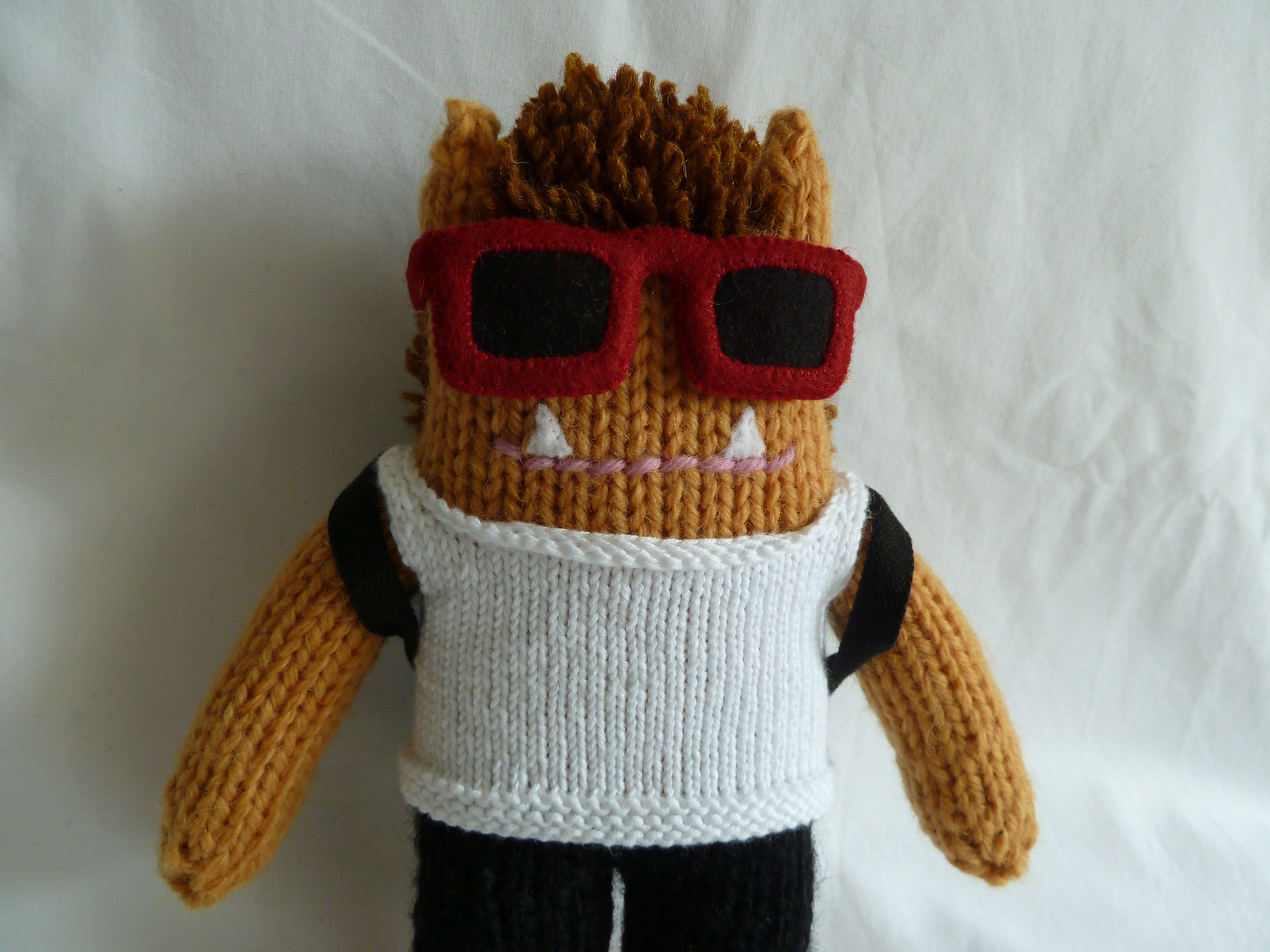 Cindy Beastie’s human counterpart rocks a stylish short hairdo, with a bit of extra fullness in the top. This style works great on a human head, but it took a little work to transfer successfully onto a Beastie! The yarn I used initially lacked the texture I was going for, and looked a bit flat and sad. So I dived back into my yarn supplies and turned up this one for a second go-around – the richer colour and slight curl makes for a livelier, more luxuriant Beastie barnet.