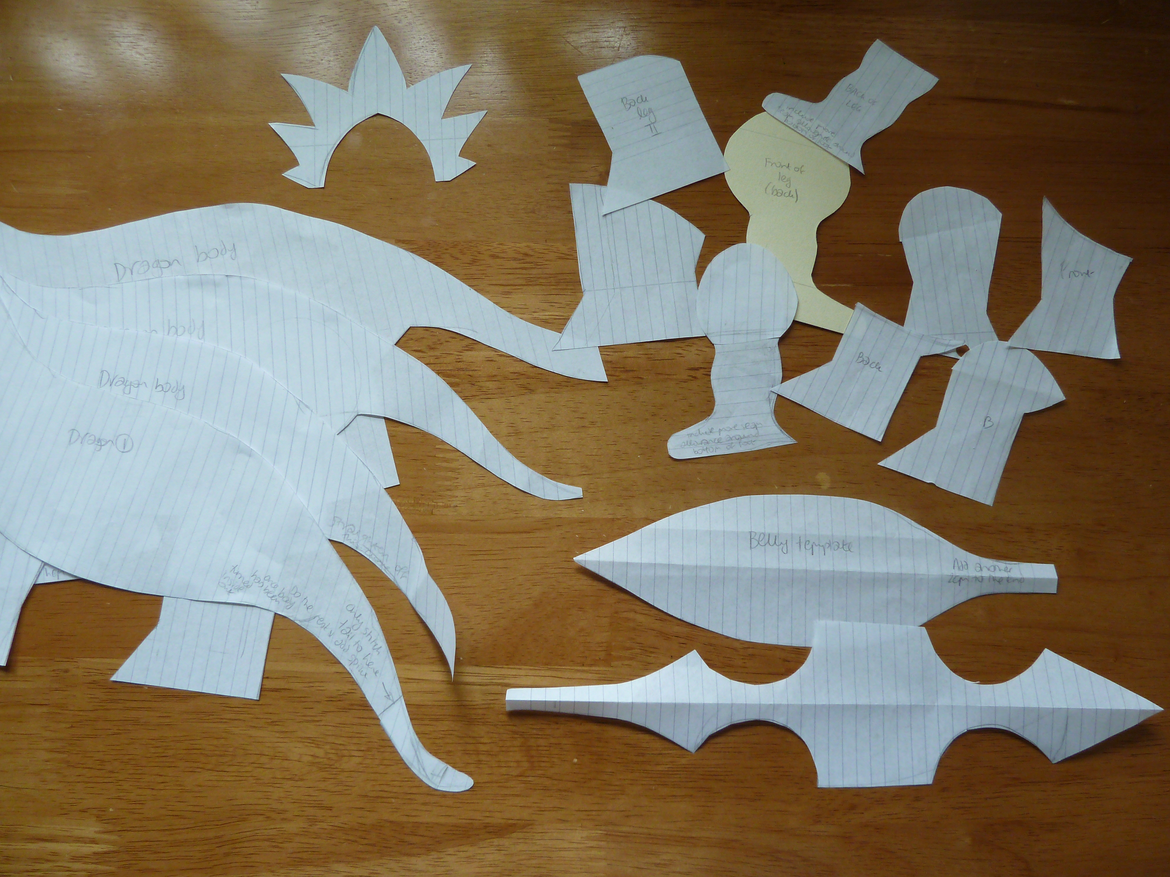 So, I went for some less temperamental satin fabrics instead… but even these proved a far cry from the wholesome, homely materials I normally use. First of all, I had to allow for fraying – something you never have to deal with when you use felt! Another of their less charming characteristics is that they show up every little detail, meaning that any slight variations between component pieces are magnified tenfold. Even doing a “rough work” dragon with some leftover calico I had at home didn’t prepare me for making the real thing… Satin fabrics, I have discovered, are designed to drape elegantly, not hold in stuffing. If you’ve ever seen someone wearing a satin dress that was a size too small, you might have an idea of what I was up against. In my quest to tame this dragon, I took on lumpy body parts, misbehaving limbs that stood out at unnatural angles from their joints, twisted tails and floppy spines. I cut, trimmed and rejected heaps of templates…