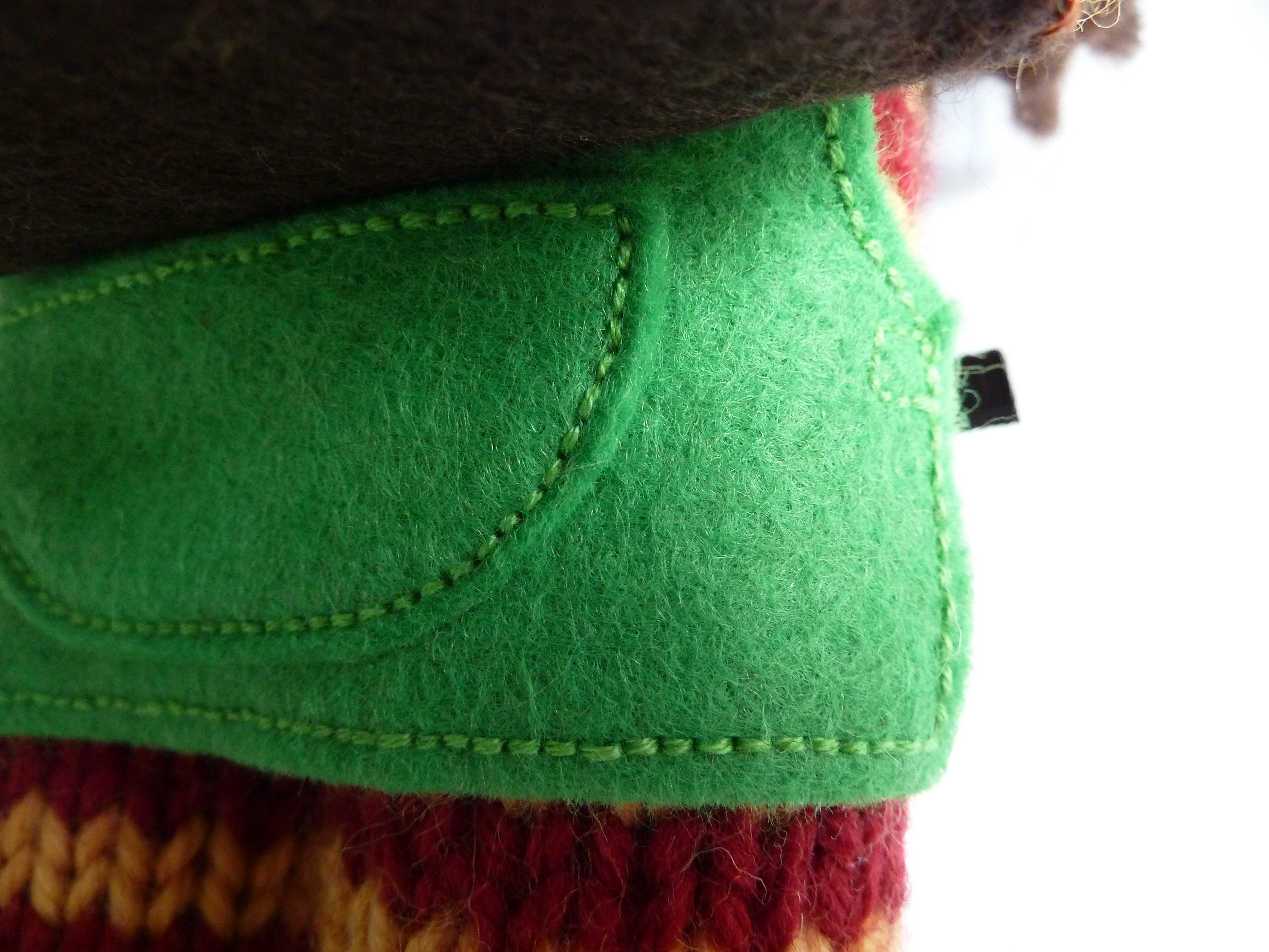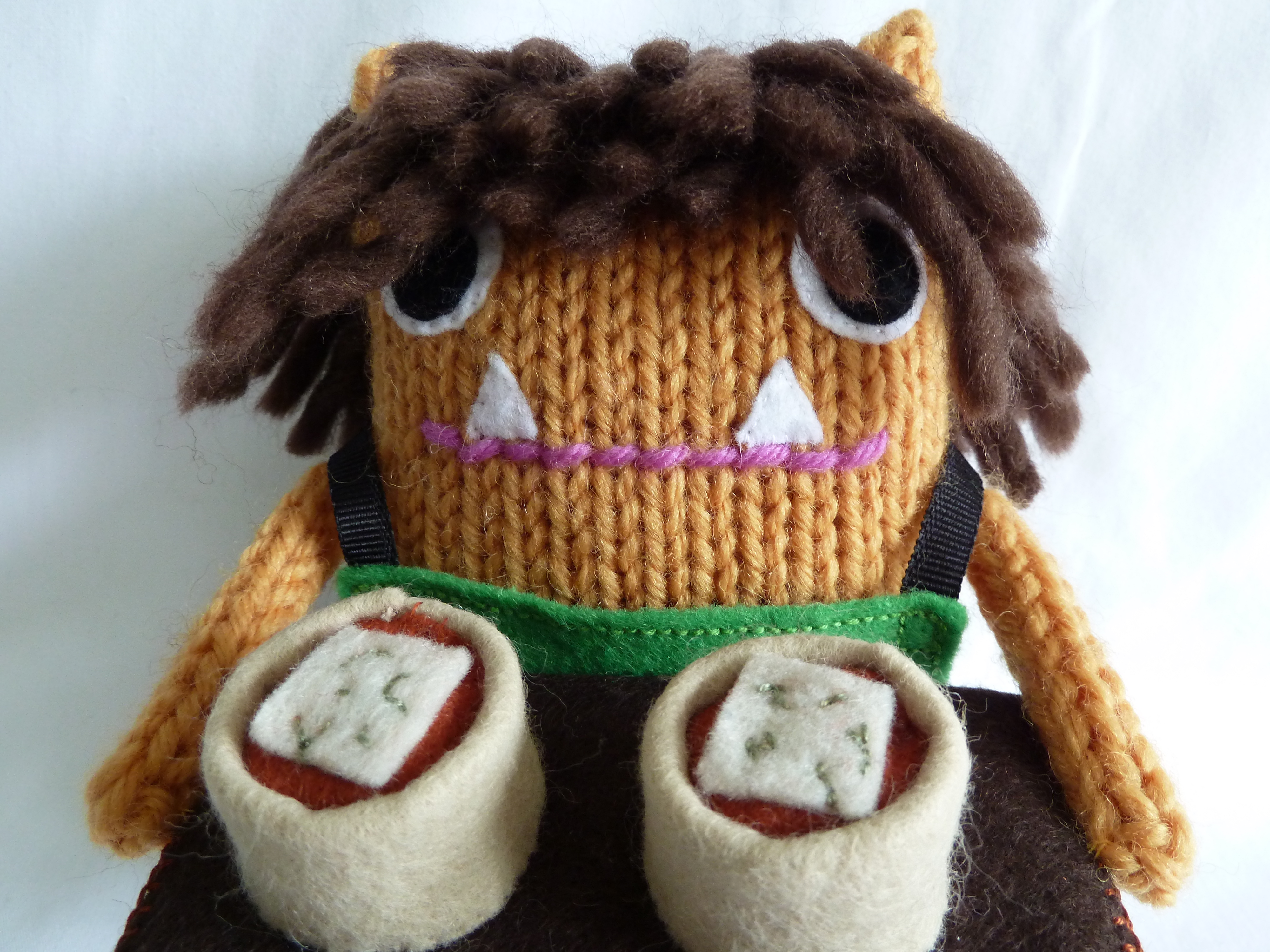 I wanted these Beasties to be recognisably a pair, without being identical… so I made one crimson with yellow stripes, and the other yellow with crimson stripes. Plus, as you can see, they have different hairstyles, smiles and pies!