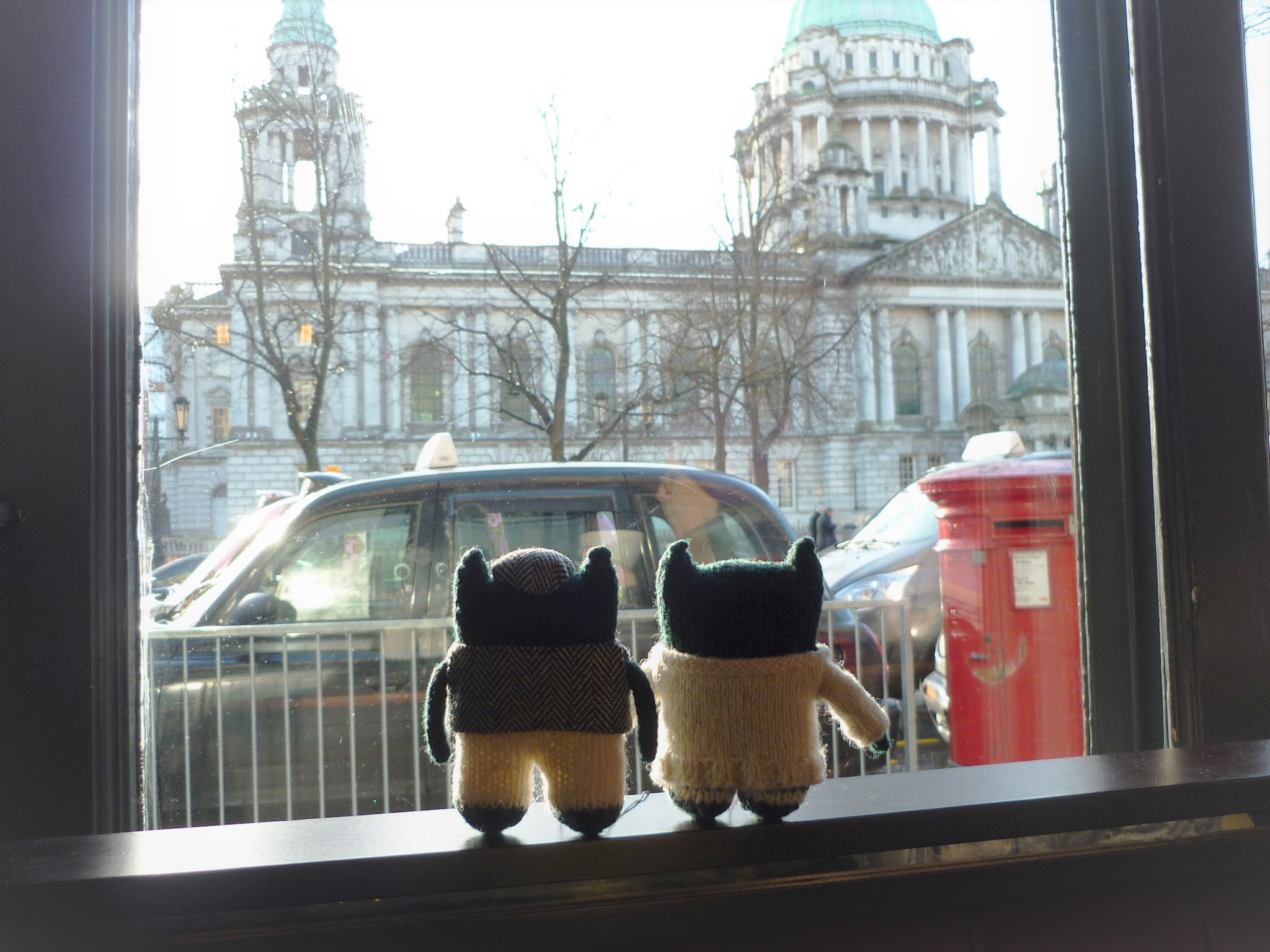 Paddy and Plunkett at Belfast City Hall - H Crawford/CrawCrafts BeastiesThey found a nice spot where they could look out at the City Hall, and watch the black taxis scoot by.