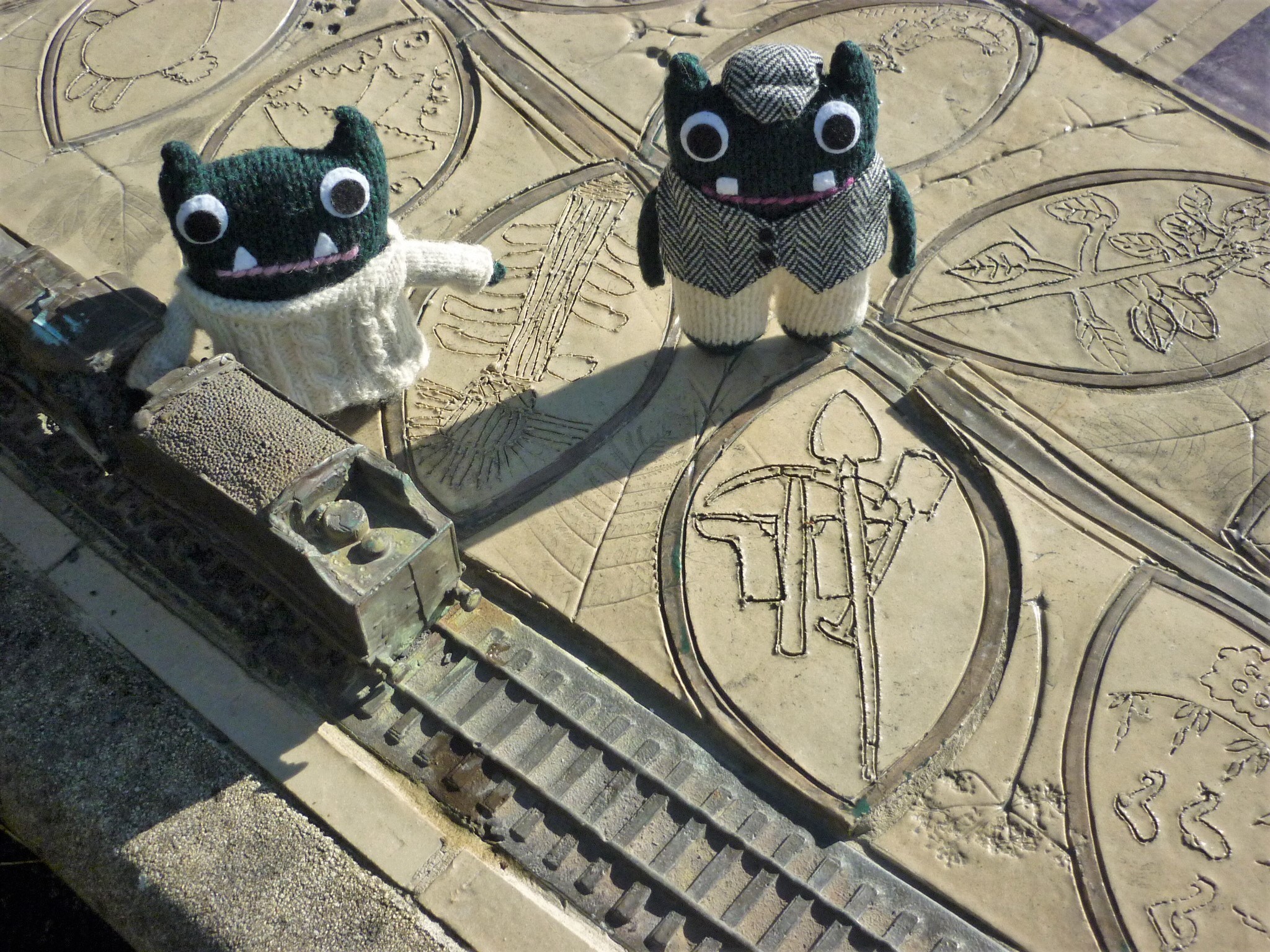 Plunkett at Titanic Slipway - CrawCrafts BeastiesThis is where the Titanic was built and launched, more than 100 years ago. This slipway was originally designed to accommodate 3 ships, but because the Olympic-class liners were so big, the area was reconfigured for 2 larger vessels. The line of posts down the left side of the photo shows how long Titanic was – Plunkett is mesmerised by the sheer scale of it! Meanwhile, Paddy has gone to trace the ship’s “footprint”, which is outlined in granite cobbles, and lit up in blue after dark!