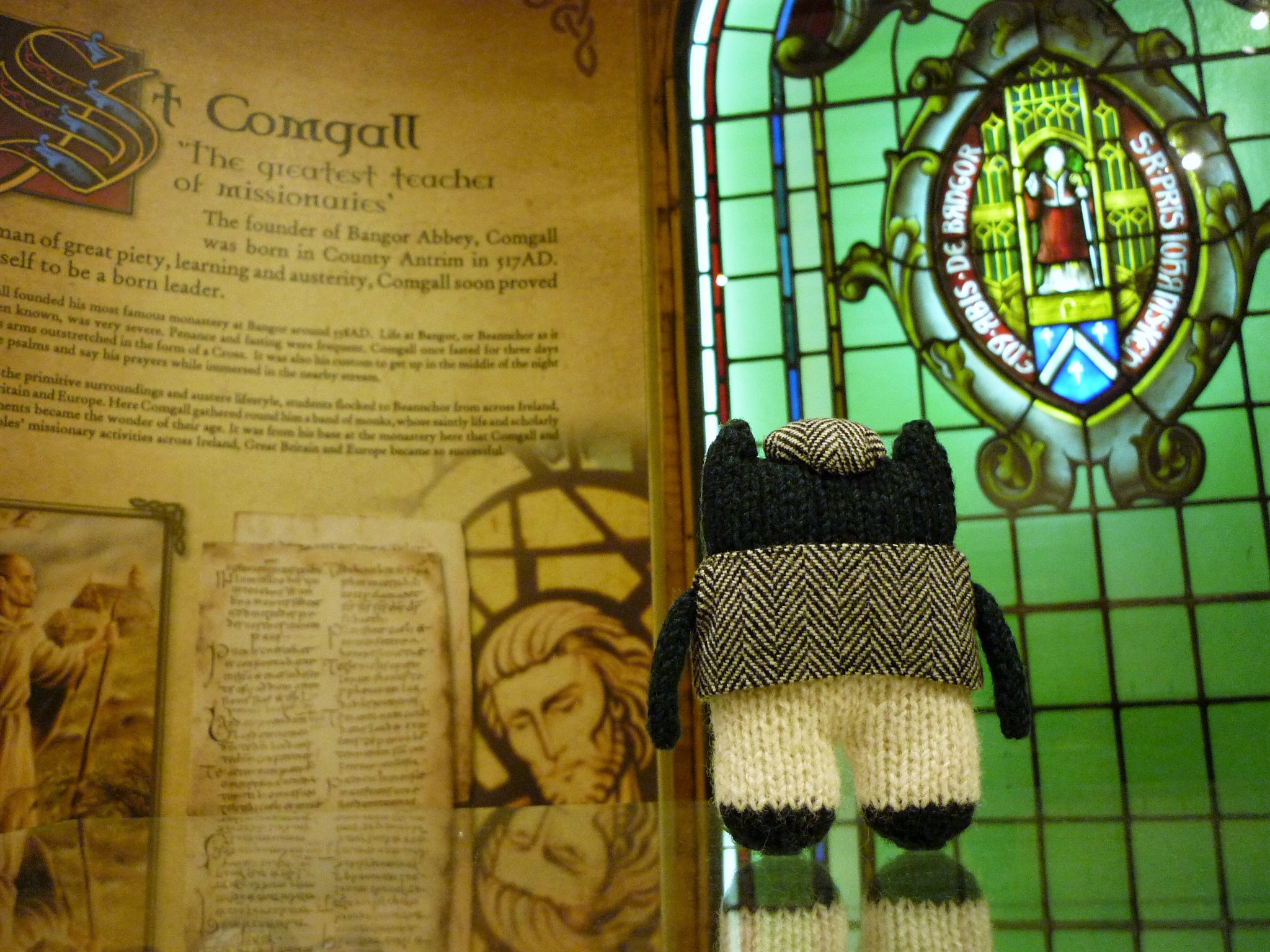 Paddy, Plunkett and the Bangor Bell - H Crawford/CrawCrafts BeastiesThis bell is made of bronze, and dates back to the 9th century, when it was most likely used to summon monks to prayer. But it’s had an interesting life! The bell was apparently unearthed by gravediggers working in the Abbey churchyard in about 1780, leading people to think that it might have been buried there to hide it from marauding Vikings. It was a savvy move, since Bangor was plundered by the Norsemen at least once around this time – that’s the downside of building your Abbey with a sea view, I guess.