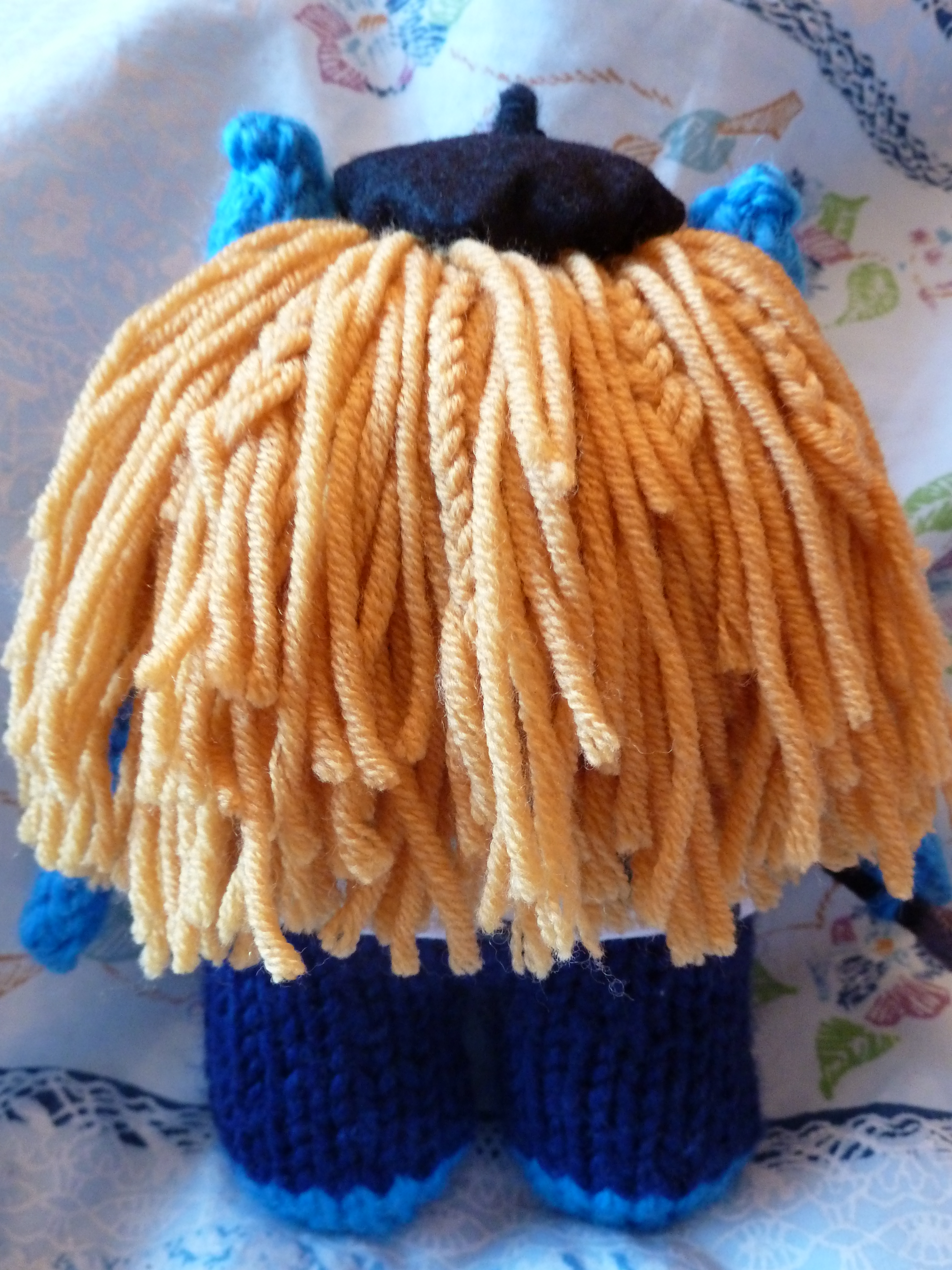 Cindy Beastie’s human counterpart rocks a stylish short hairdo, with a bit of extra fullness in the top. This style works great on a human head, but it took a little work to transfer successfully onto a Beastie! The yarn I used initially lacked the texture I was going for, and looked a bit flat and sad. So I dived back into my yarn supplies and turned up this one for a second go-around – the richer colour and slight curl makes for a livelier, more luxuriant Beastie barnet.