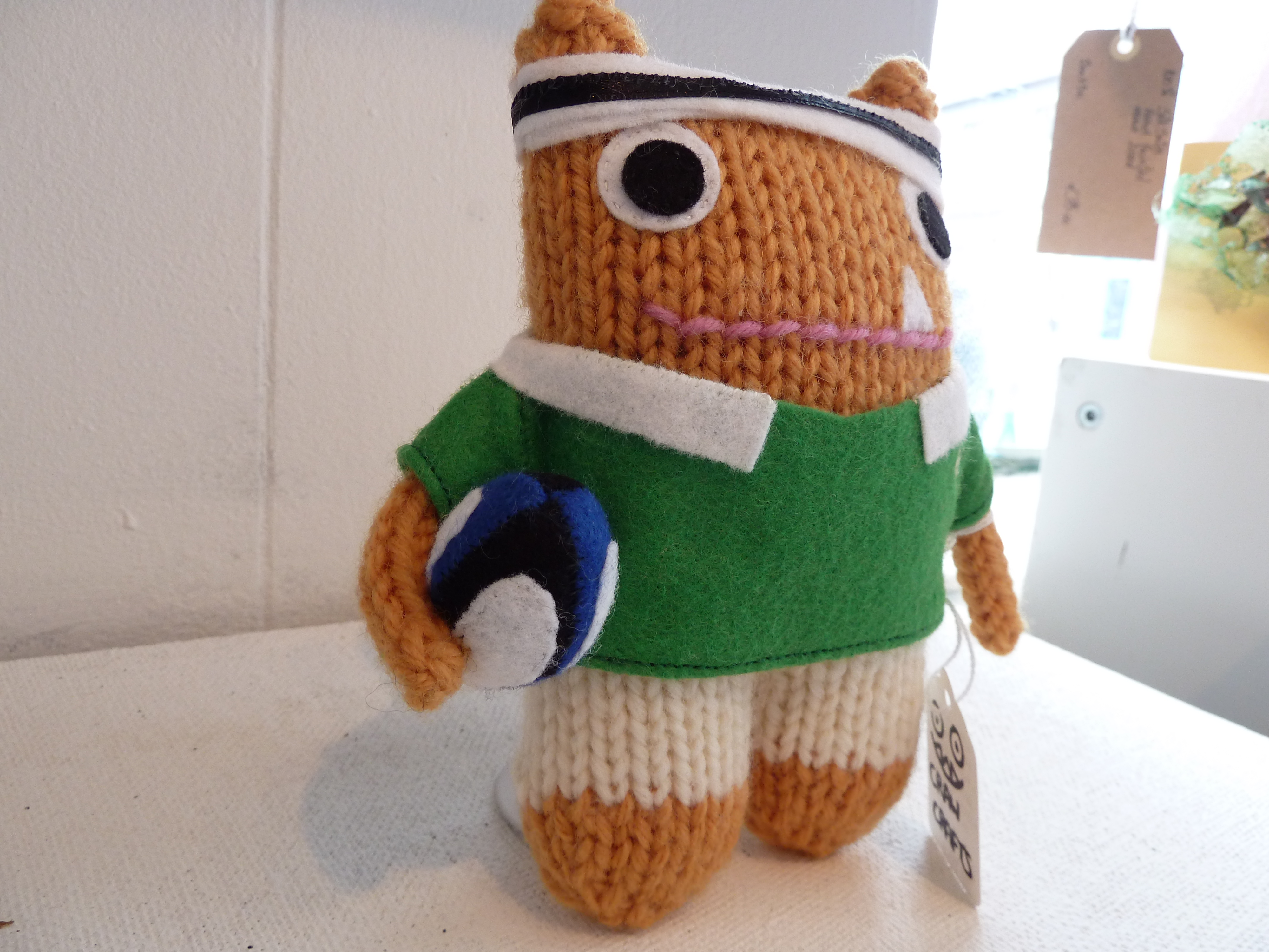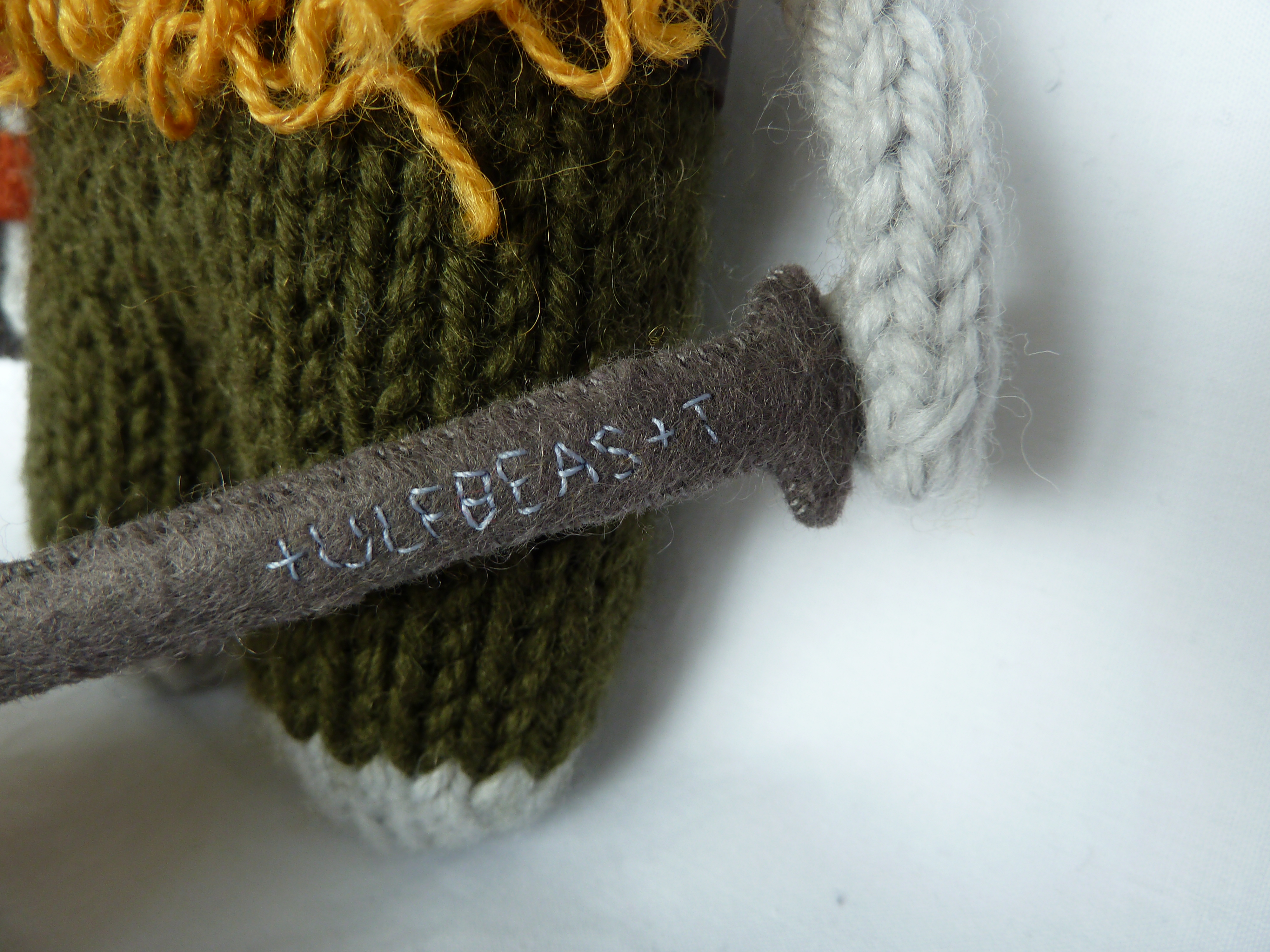 But Viking Beastie is most proud of his sword. Forged from the finest weapons-grade felt, it bears the maker’s mark “+ULFBEAS+T” on the blade – a striking parallel to the prestigious Ulfbehrt human-sized Viking swords which have been found across Europe. Ulfbehrt swords were made from high quality crucible steel – this means that the metal was produced at extremely high temperatures, which reduced impurities and upped its carbon content, giving a blade that was stronger, more flexible and less brittle than anything else available at the time. That, as well as their scarcity, made them highly desirable objects – the Rolls Royce or Birkin bag of Viking weaponry! So sought-after were Ulfbehrt swords that there may even have been a hearty trade in cheap(ish) knock-offs… archaeologists have found several similar-looking swords bearing the distinctive mark “+ULFBERH+T” that turned out to be made of inferior metal!