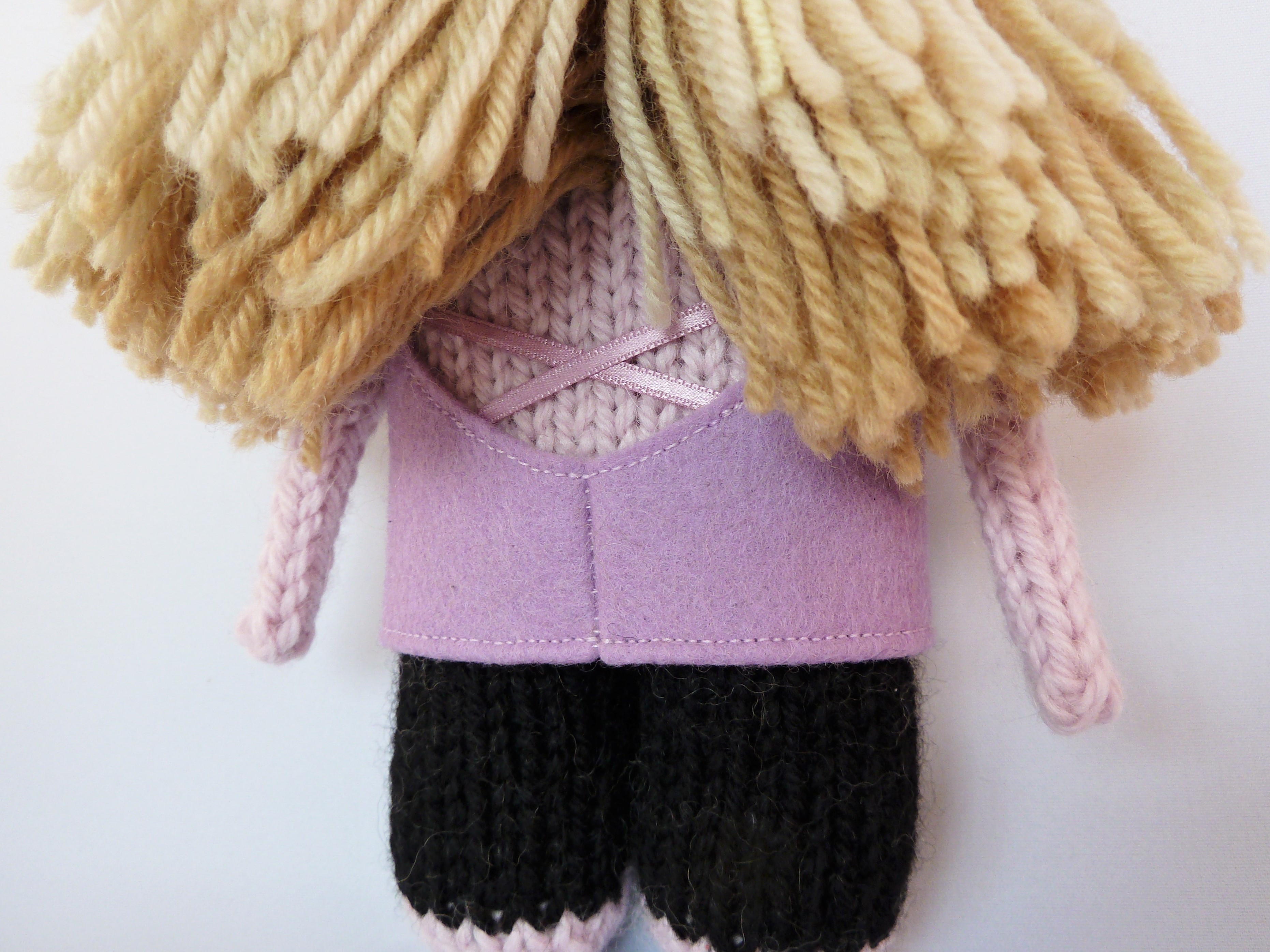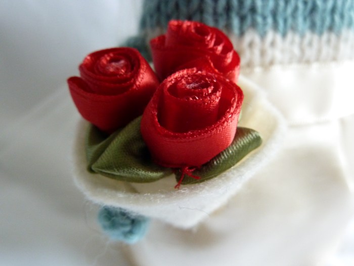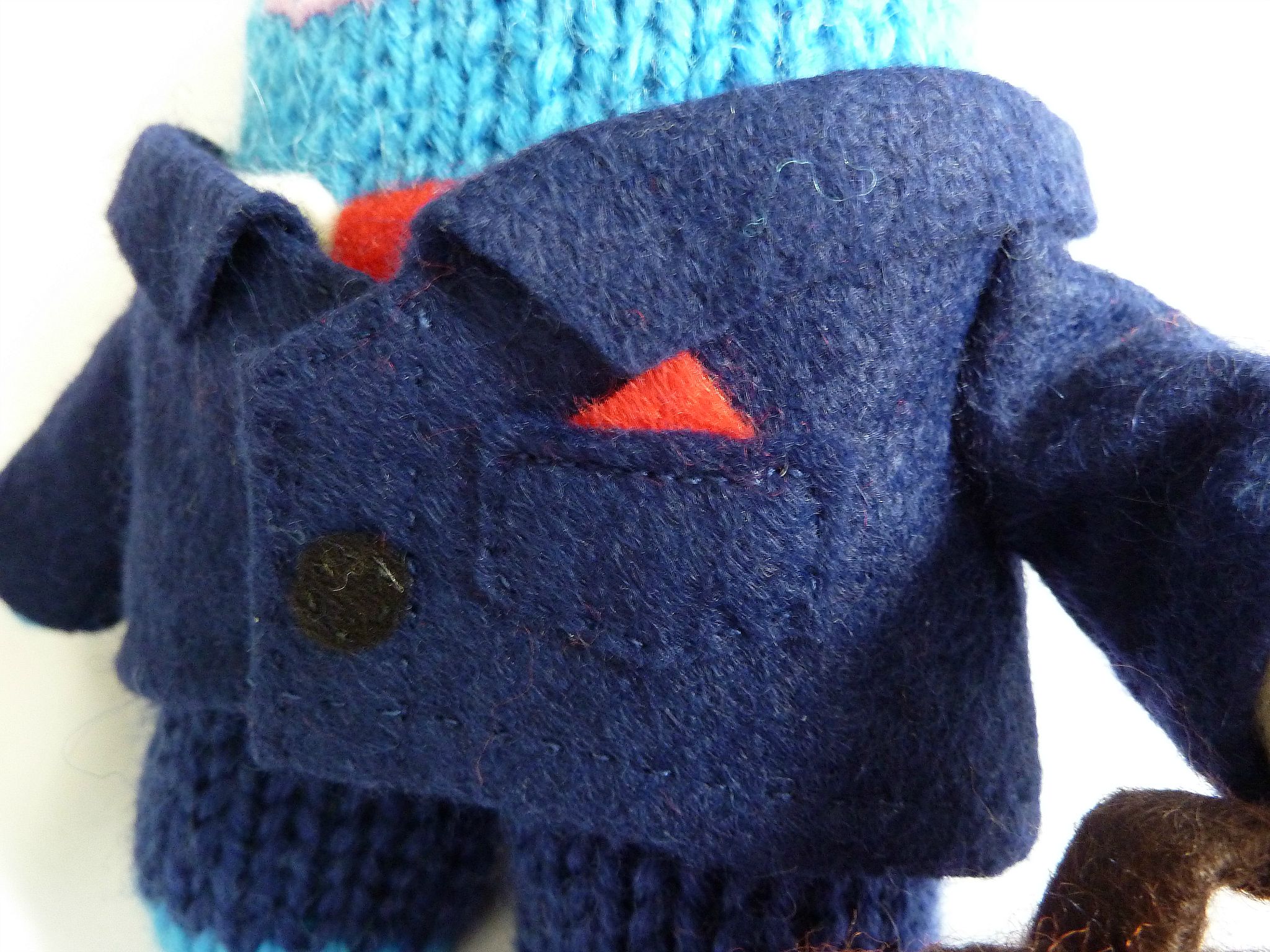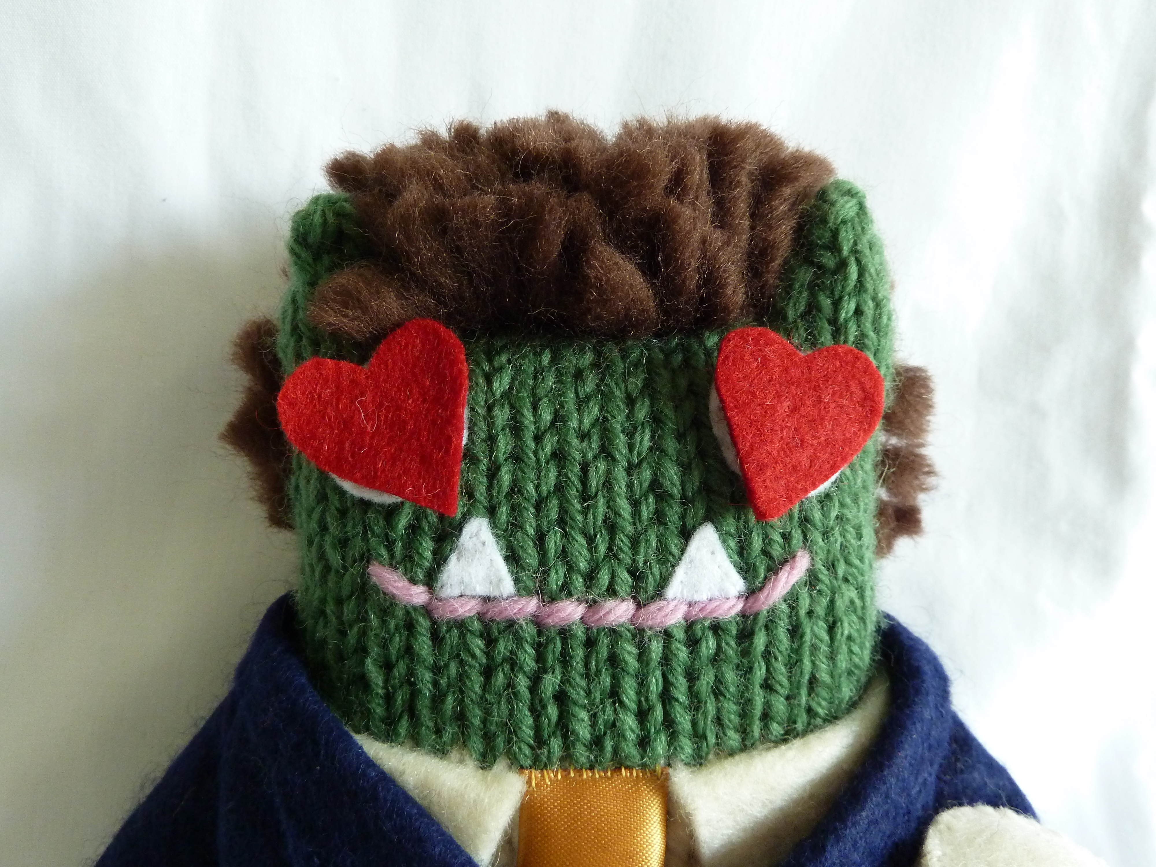 For this little monster guy, I took inspiration from the same engagement photo that I used as reference for his bride-to-be, and tried to capture the details of his outfit as closely as possible. So that started with his grey knitted beanie, and then I got to work on copying his outdoor jacket exactly.