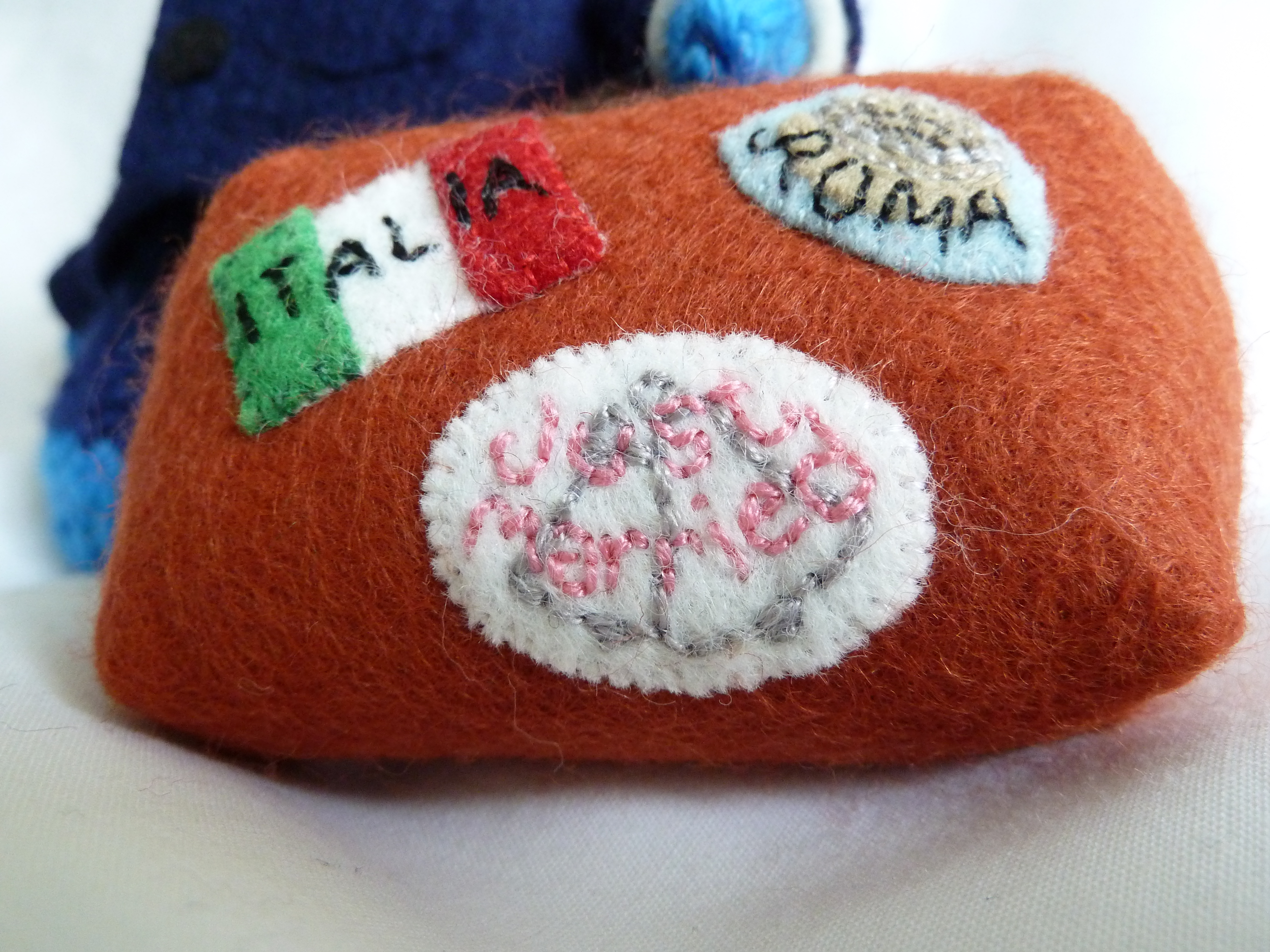 As before, this Beastie-sized camera has a removable strap and lens, and details in felt appliqué or embroidery.